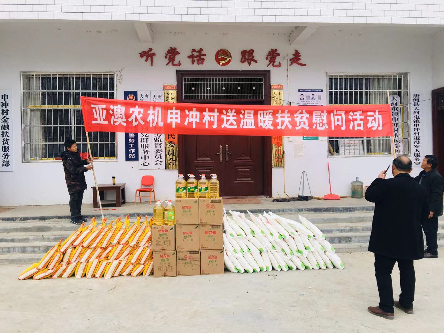 為積極貫徹落實唐河縣委縣政府”百企幫百村”的扶貧工作精神,履行企業(yè)社會責(zé)任,按照縣扶貧辦工作統(tǒng)一部署,亞澳農(nóng)機(jī)結(jié)合對口幫扶的申沖村實際情況,因地制宜,統(tǒng)籌規(guī)劃,務(wù)求實效,在2018-2019年開展了一系列的扶貧幫困工作。